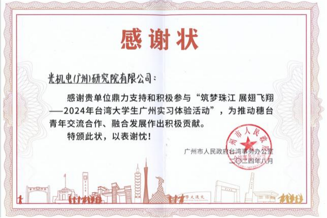 本次活動,光機(jī)電獲得來自廣州市臺辦的感謝狀,以表彰光機(jī)電在推動穗臺青年交流合作、融合發(fā)展作出積極貢獻(xiàn)。據(jù)統(tǒng)計(jì),光機(jī)電已經(jīng)連續(xù)8年作為臺灣大學(xué)生廣州(黃埔)實(shí)習(xí)體驗(yàn)活動承辦單位,并且持續(xù)榮獲市委臺辦、區(qū)統(tǒng)戰(zhàn)部共同頒發(fā)的“優(yōu)質(zhì)服務(wù)獎(jiǎng)”榮譽(yù)稱號。