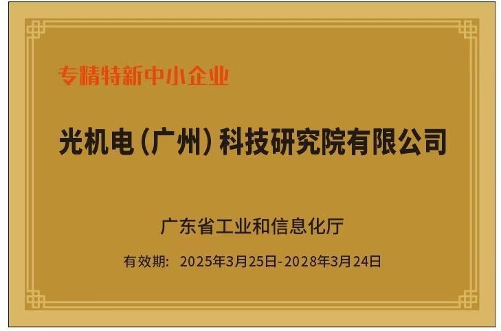 近日,經(jīng)廣州市工業(yè)和信息化局認(rèn)定、廣東省工業(yè)和信息化廳審核,光機(jī)電科技公司獲得2024年廣東省“專精特新中小企業(yè)”稱號(hào),在研發(fā)投入、產(chǎn)品創(chuàng)新、市場(chǎng)競(jìng)爭(zhēng)力等方面均達(dá)到專精特新中小企業(yè)認(rèn)定標(biāo)準(zhǔn),是公司繼獲得“國(guó)家高新技術(shù)企業(yè)”稱號(hào)后的又一喜訊,創(chuàng)新實(shí)力邁上新臺(tái)階。
